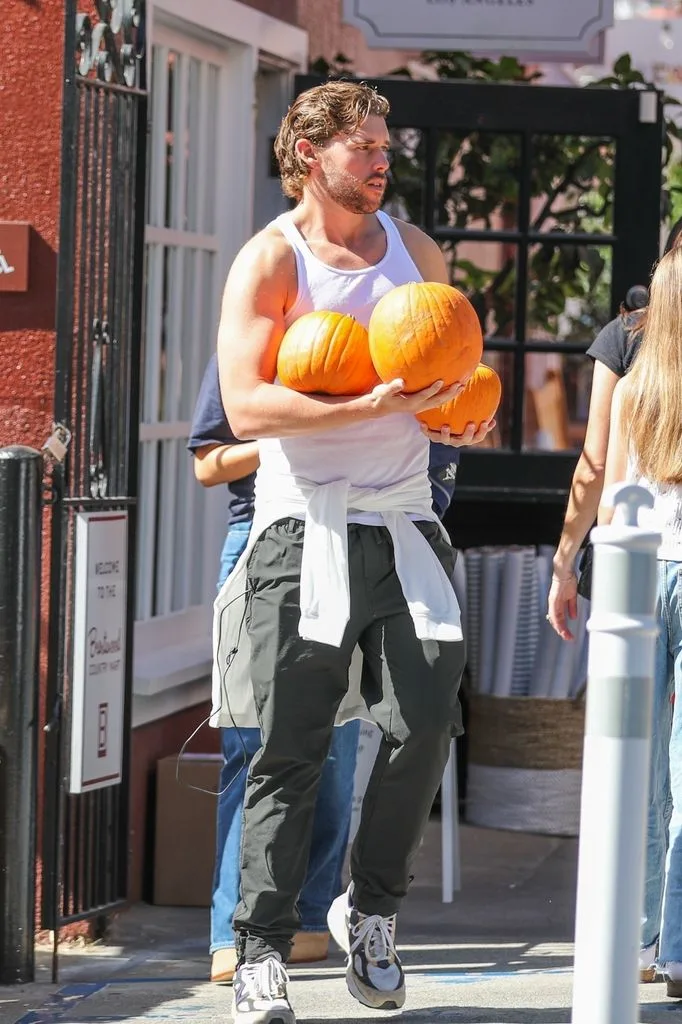 Christopher’s toned arms and shoulders stood out in his white tank top and joggers. He could be seen laughing while carrying pumpkins through the patch.