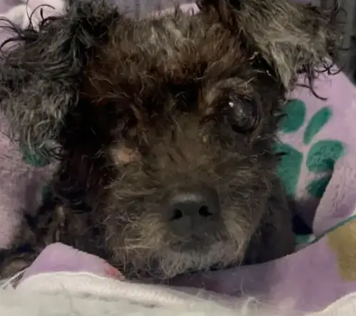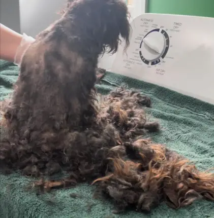 The moment the staff at the shelter helped get rid of the tangled fur, the sweet dog felt relieved and started staring at her rescuers.