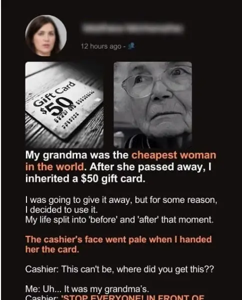 I had always thought of Grandma as the stingiest woman alive. After her funeral, I found the gift card tucked away among her belongings. Initially, I almost gave it away, dismissing it as insignificant. But on a quiet afternoon, curiosity got the better of me, and I handed it to a cashier.