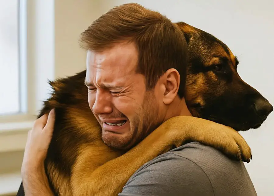 The dog, as if it understanding every word, rested its paws on his shoulders and pressed close. Then, something extraordinary happened. Its eyes cleared. It looked at the owner with a spark of life, let out a soft whine, and even managed to stand, nuzzling his face.
